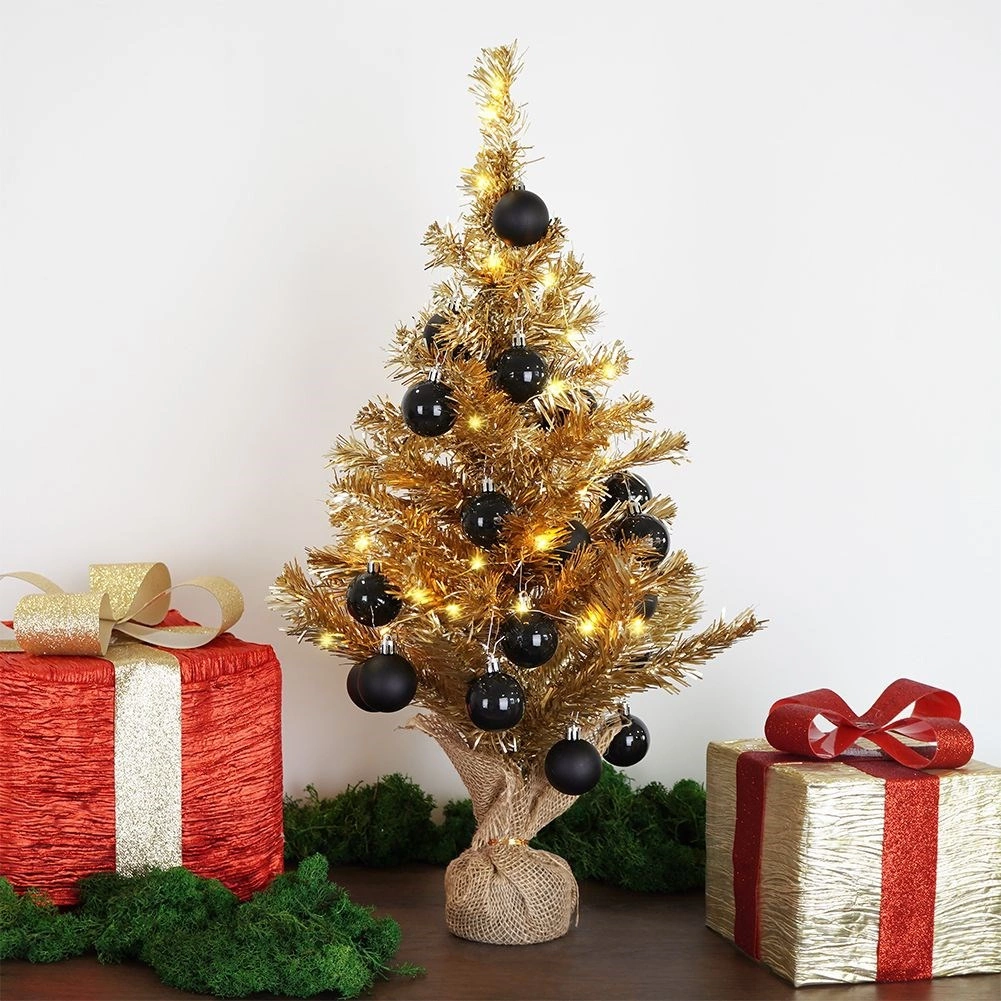 To kompaktno umetno božično drevo v razkošni zlati barvi je odlična izbira za stanovanje, pisarno in manjše prostore. Zahvaljujoč čvrstemu kovinskemu jedru in stabilnemu betonskemu stojalu v jutenem ovoju trdno stoji in ga je enostavno postaviti na mizo, polico ali okensko polico.