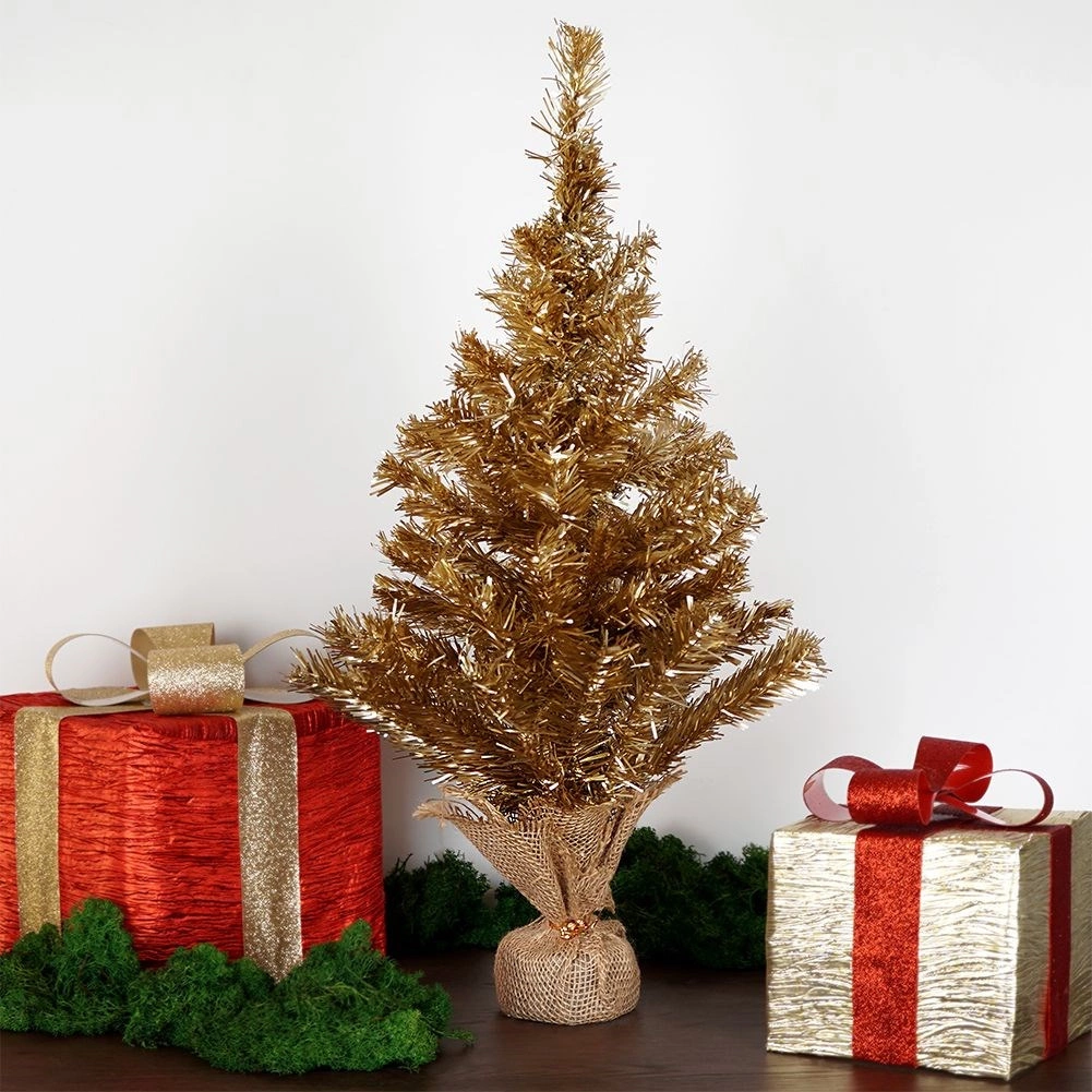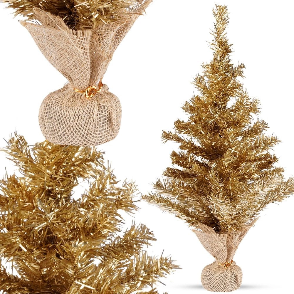 Elegantno zlato namizno božično drevo višine 60 cm z bleščečimi iglicami in stabilno kovinsko konstrukcijo v jutenem ovoju. Idealna dekoracija za mizo, komodo ali recepcijo – prihrani prostor in ustvari takojšnje praznično vzdušje.