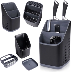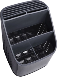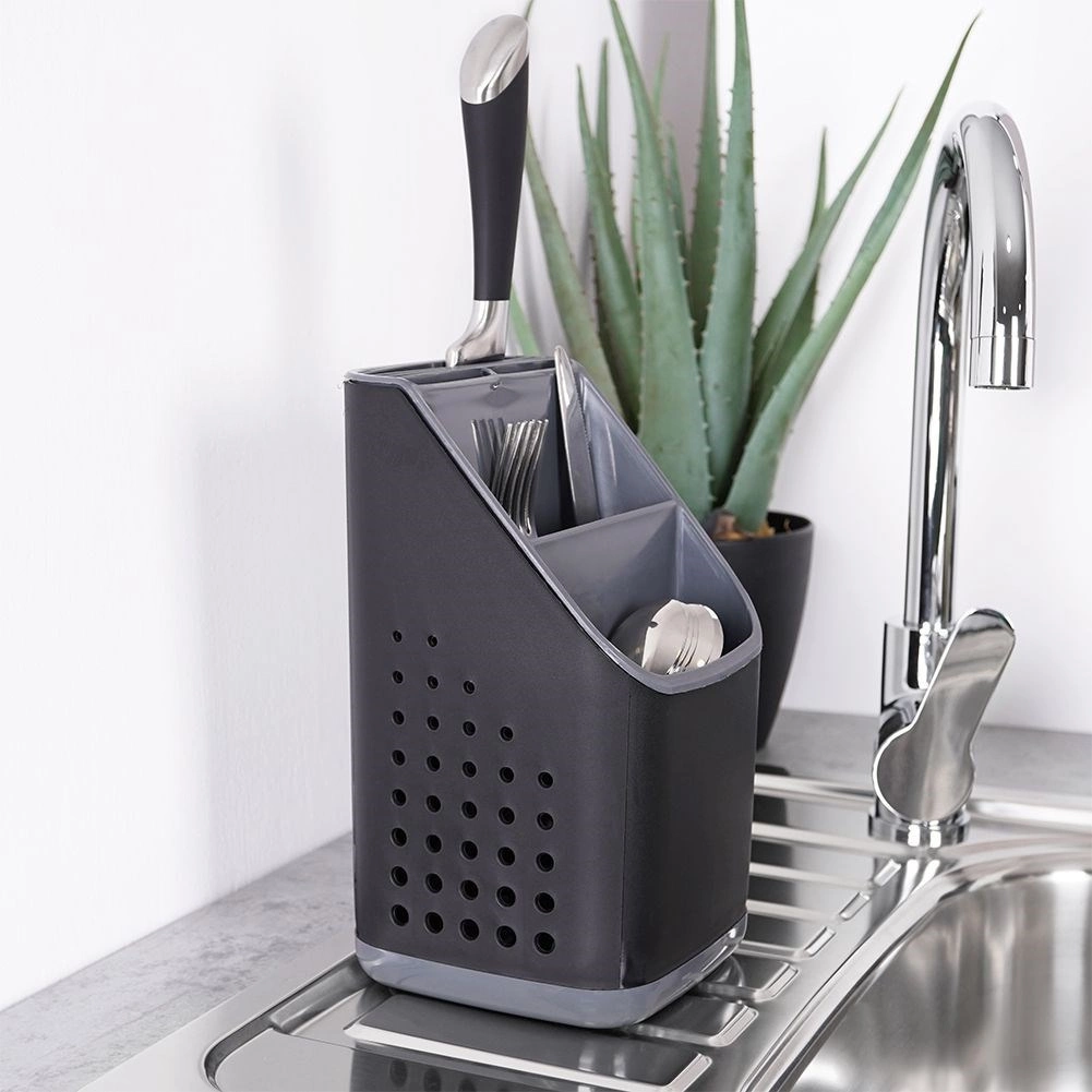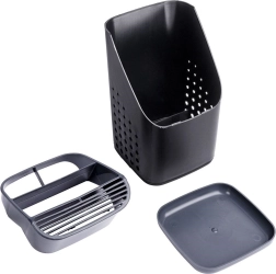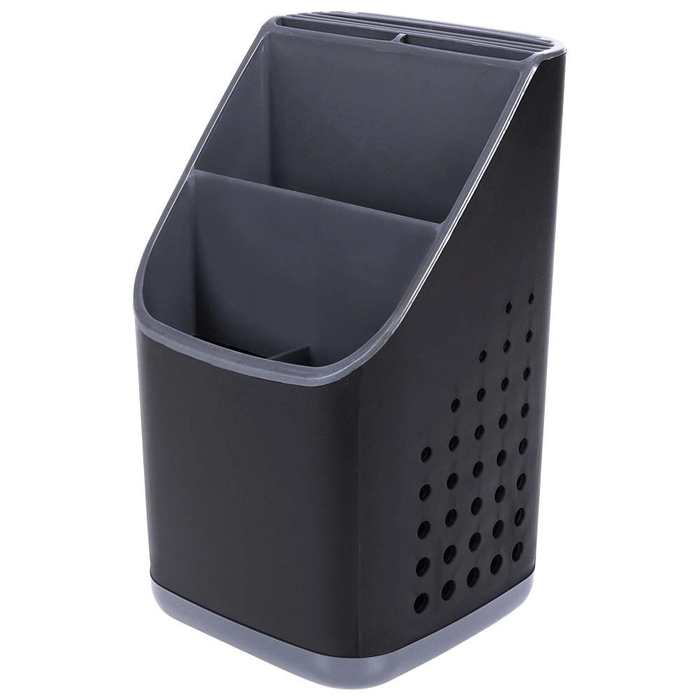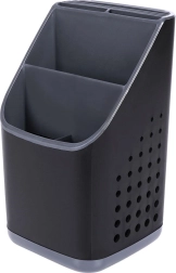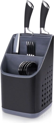 Visokokakovostna plastika v črni barvi z grafitnimi detajli deluje moderno in se poda večini kuhinj. Z odstranitvijo notranjega organizatorja dobite prostoren enoprekatni vsebnik na primer za večje pripomočke. Zaradi kompaktnih mer se prilega na odcejevalnik pomivalnega korita ali na delovni pult in ne ovira dela.