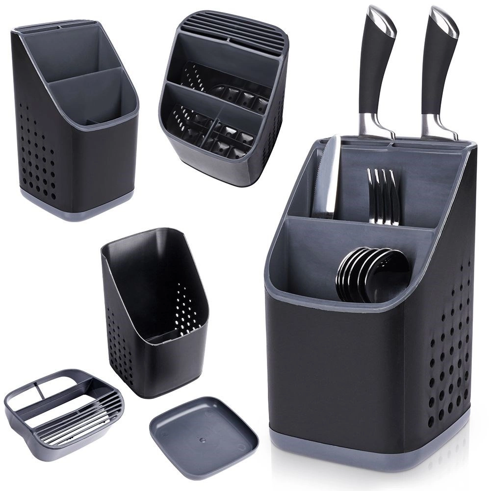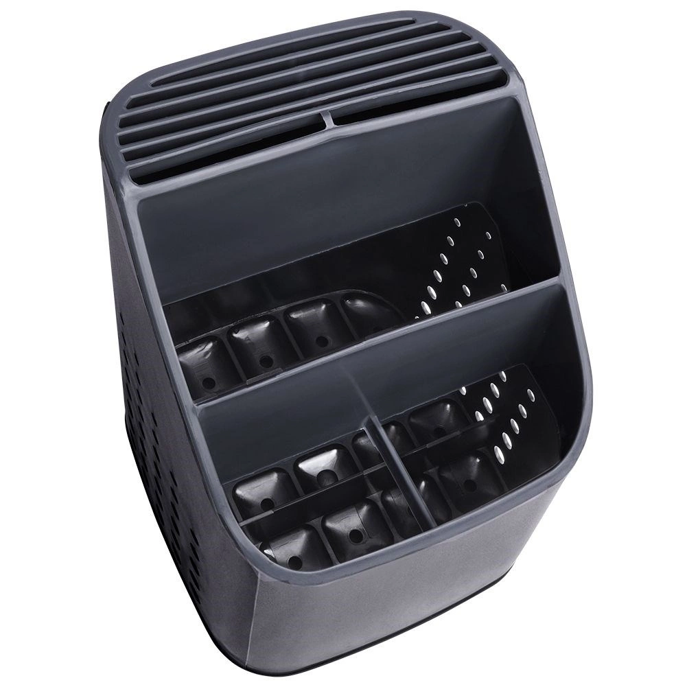 Praktičen odkapnik in organizator za pribor ter kuhinjski pripomočki v elegantni črni barvi z grafitnimi poudarki. Zaradi premišljene zasnove z odstranljivim vloženim razdeljevalnikom, zgornjim držalom za nože in odkapno posodico bodo vaši kuhinjski pripomočki suhi in na svojem mestu. Lahek, vzdržljiv in enostaven za čiščenje pomočnik za vsako kuhinjo.