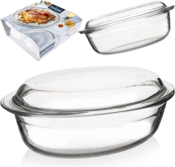 Obvladajte domače pečenje z ovalno stekleno posodo s pokrovom s prostornino 3 l. Izdelana iz borosilikatnega stekla, odporna od -20 °C do +300 °C, primerna za pečico in mikrovalovko, z enostavnim čiščenjem v pomivalnem stroju. Obe części je mogoče uporabljati samostojno ali skupaj – pokrov služi kot druga pekač.