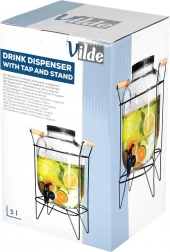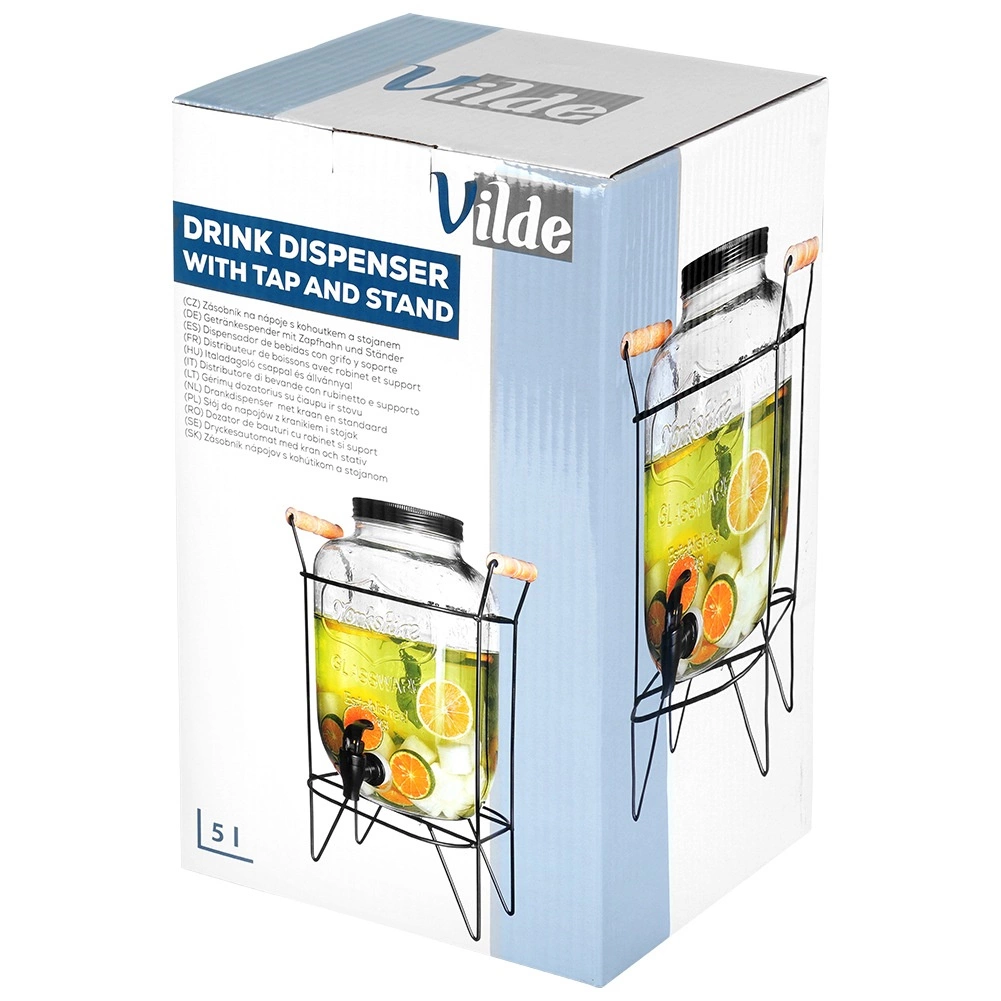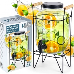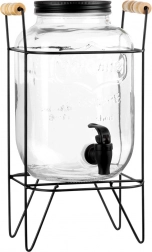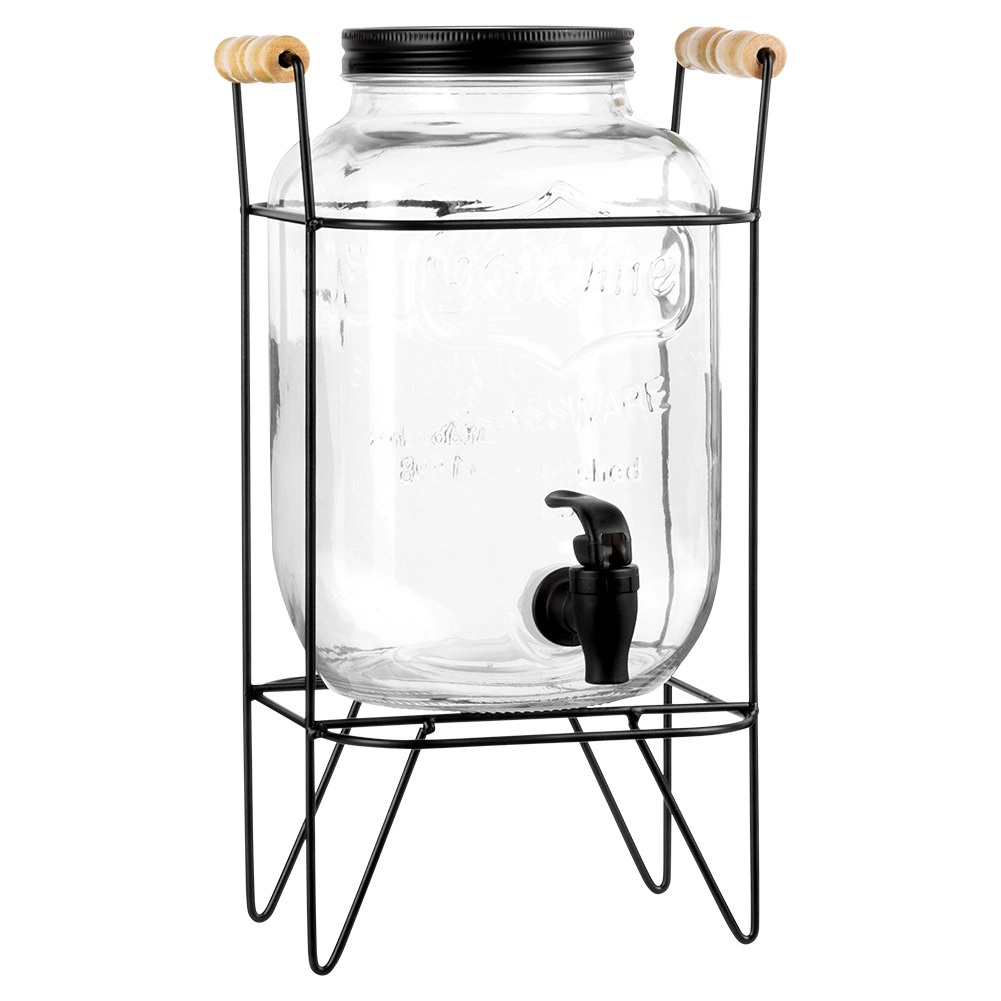 Stilski stekleni dozirnik pijač s prostornino 4,2 l s praktično pipico in stabilnim kovinskim stojalom v črni barvi. Idealen za serviranje limonad, sokov, ledenega čaja ali kuhančkov na vrtnih zabavah in doma. Ima navojni pokrov, reliefno okrasje in udobno točenje zahvaljujoč povišanemu položaju na stojalu.