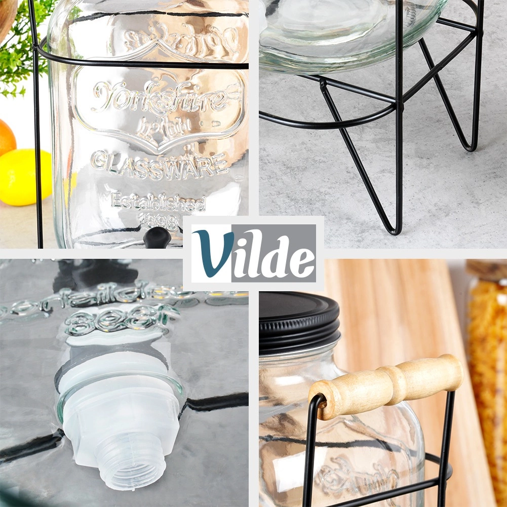 Eleganten dozirnik iz kakovostnega debelega stekla izstopa na vsaki mizi in olajša strežbo gostov. Povišano stojalo iz mat kovine z lesenimi ročaji omogoča prostor za kozarce pod pipico in zagotavlja stabilnost. Črn navojni pokrov ščiti pijačo pred žuželkami in nečistočami.