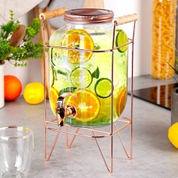 Ta stilski dozirnik združuje kakovostno debelo steklo z dekorativnim reliefnim okrasjem in kovinskim stojalom v odtenku rožnatega zlata z lesenimi ročaji. Dvignjena postavitev posode zagotavlja udobno točenje v kozarce brez premikanja posode. Kovinski navojni pokrov ščiti vsebino pred nečistočami in mrčesom, zato je dozirnik odličen za uporabo na prostem in doma.