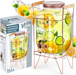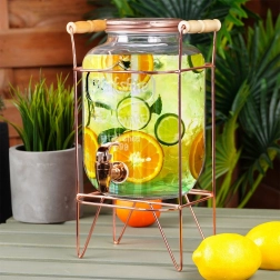Eleganten stekleni dozirnik za pijače s prostornino 4,2 l s stabilnim stojalom v barvi rožnatega zlata in praktično pipico za enostavno postrežbo. Idealen za limonade, punch, sadne vode in ledene čaje med zabavami, pikniki z žarom in družinskimi srečanji. Širok vrat olajša dodajanje leda in sadja, navojni pokrov zaščiti pijačo pred mrčesom.