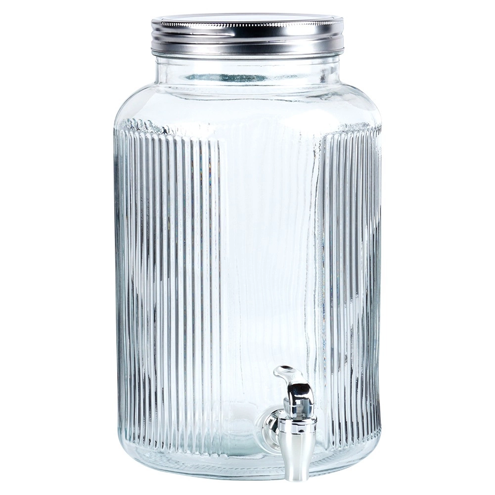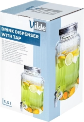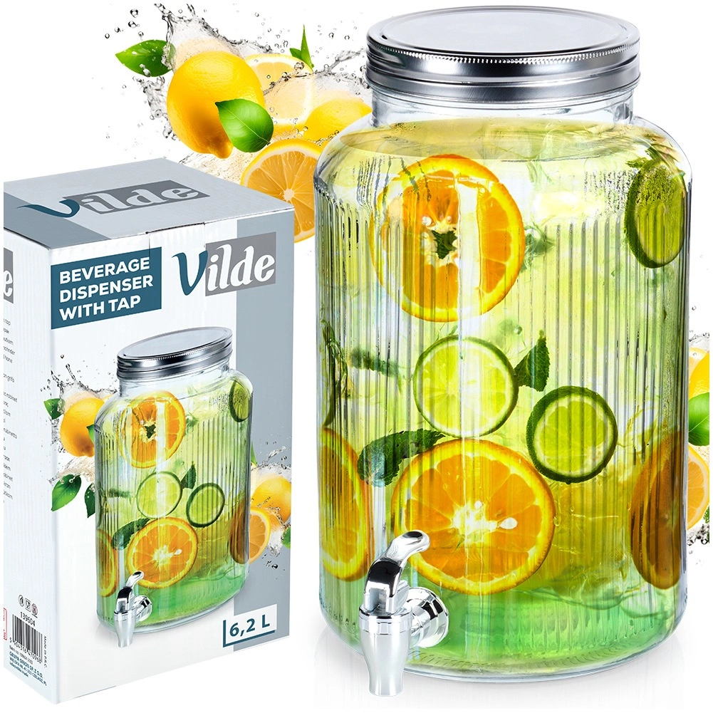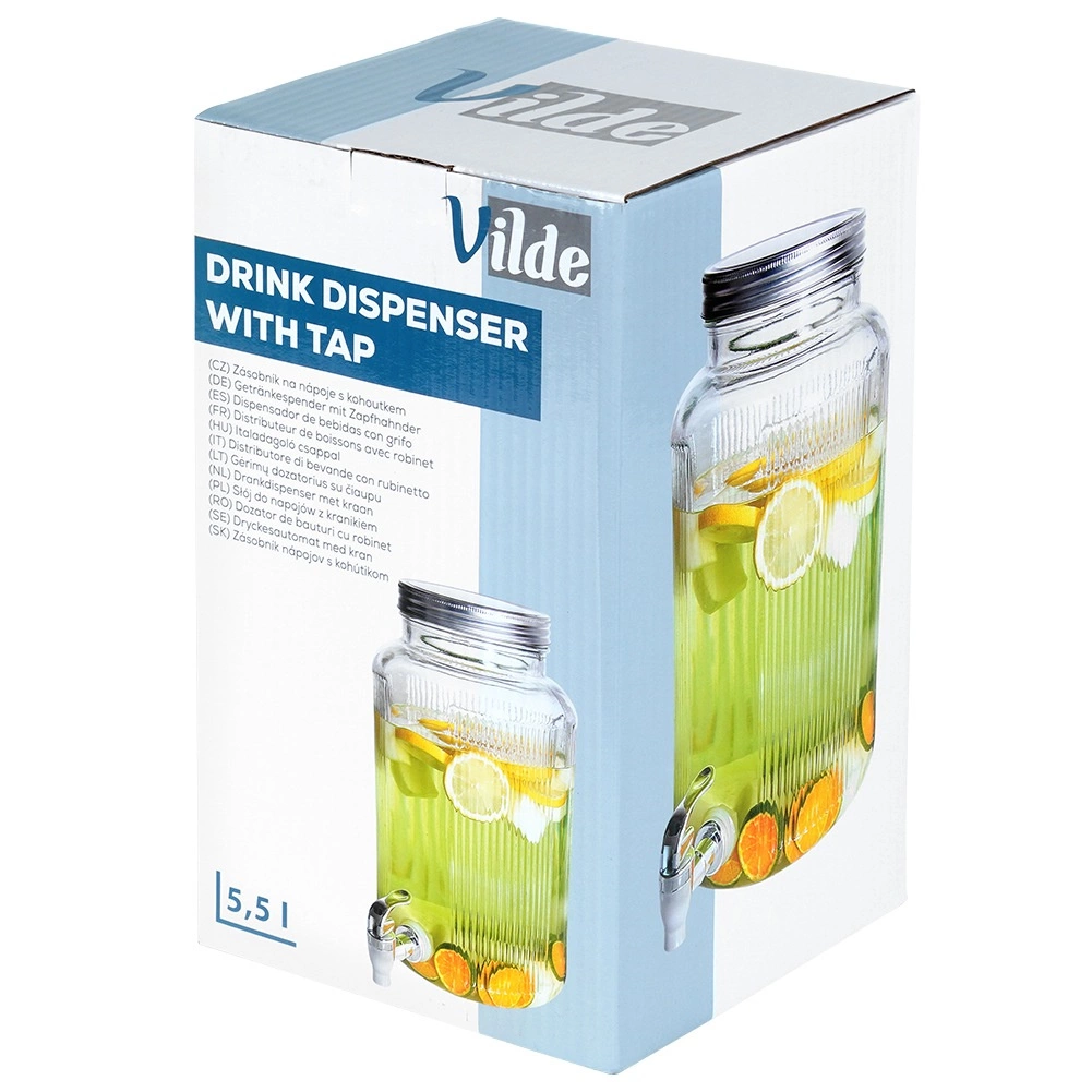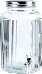Velikovolumni stekleni dozirnik s pipo olajša serviranje pijač ob vsaki priložnosti. Široko grlo omogoča udobno polnjenje in čiščenje, prosojno telo pa omogoča nadzor nad vsebino, kovinski pokrov pa zanesljivo zaščiti pijačo pred insekti. Idealen za vodo s citrusom, domačo limonado, sokove, sangrio ali punč (ni za vroče pijače).