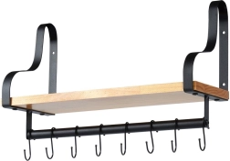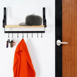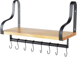 Odkrijte pametno rešitev za organizacijo doma. Ta stenska polica nudi stabilno odlagalno površino iz naravnega lesa in spodaj uporaben reling z 8 kljukami za obešanje skodelic, krp, ključev ali brisač. Minimalistični kovinski okvir v črni barvi poudari moderen industrijski videz, ki ga zlahka uskladite z modernim ali klasičnim interierjem.