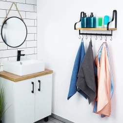 Praktična stenska polica z relingom in osmimi kljukami združuje trdno kovinsko konstrukcijo v črni barvi z naravno leseno polico. V univerzalnem industrijskem LOFT slogu odlično pristaja kuhinji, kopalnici, predsobi in spalnici ter nudi varčno in pregledno shranjevanje začimb, skodelic, brisač ali dodatkov. Montažni komplet je priložen.