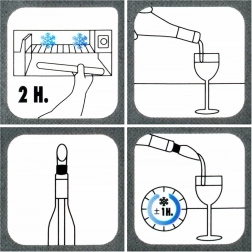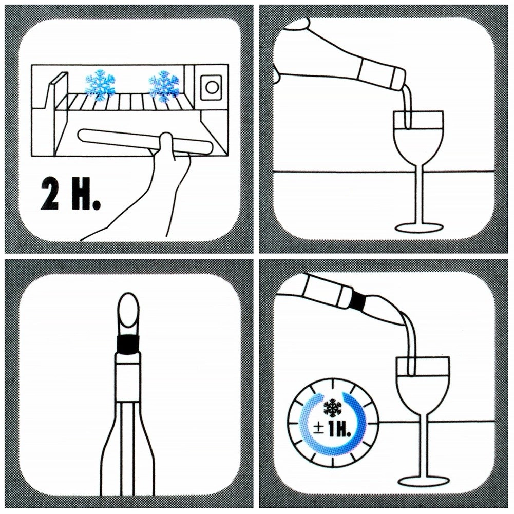 Uporaba je preprosta: hladilno palčko za najmanj 2 uri položite v zamrzovalnik, spojite z nalivalnikom in vstavite v ohlajeno steklenico. Idealno za belo, rosé in peneče vino, pa tudi za druge ohlajene pijače.