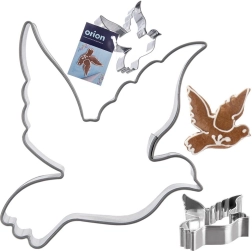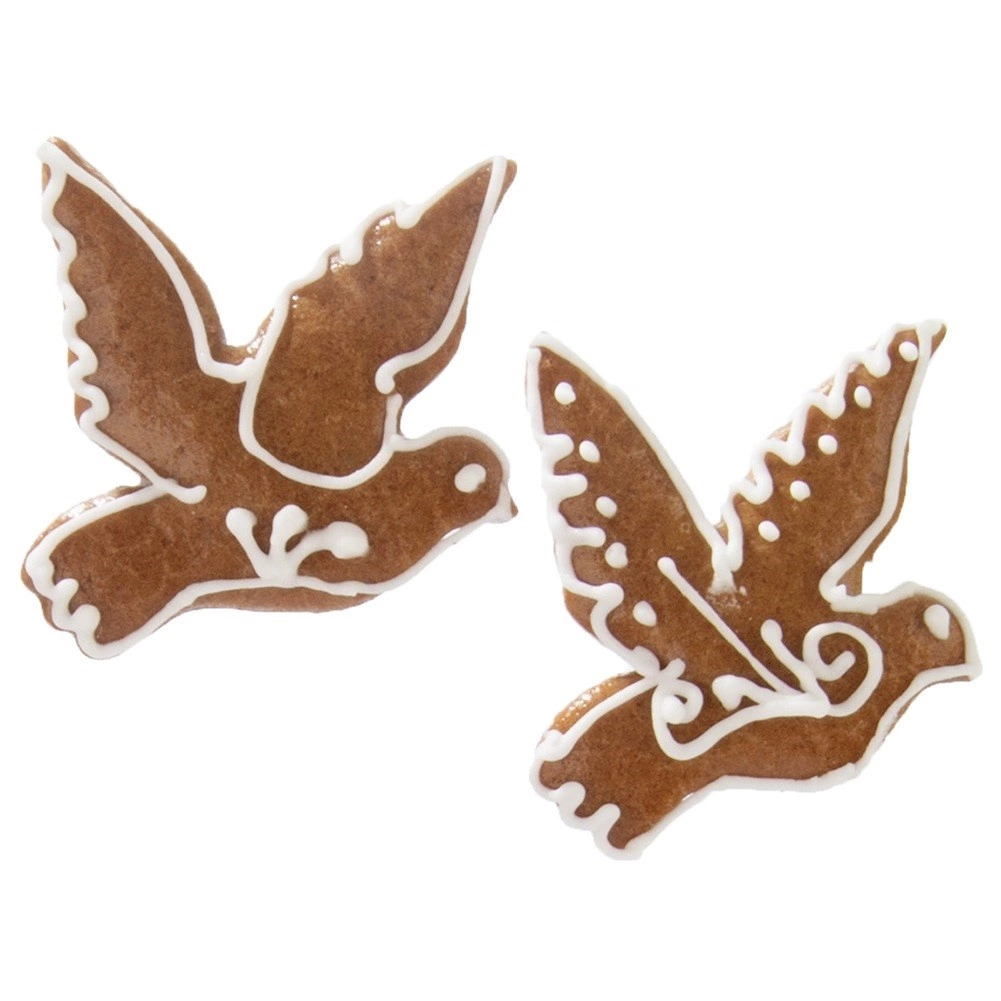 Praktičen nerjaven kalup za izrezovanje v obliki golobice s krili za enostavno oblikovanje piškotov, medenjakov in fondantnih dekoracij. Zaradi mer 6 × 5 cm in trdnega nerjavnega jekla reže čiste obrise, ima univerzalno uporabo v kuhinji in je primeren za pomivalni stroj.