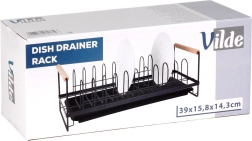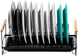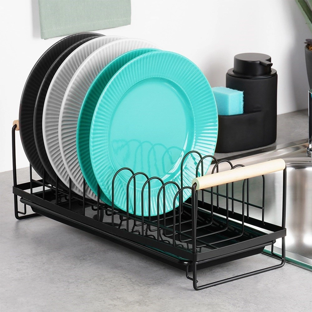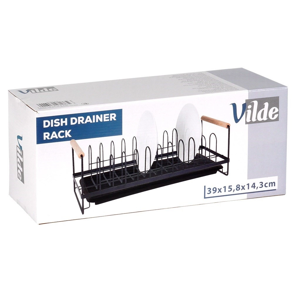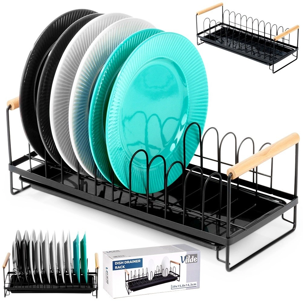 Kompakten odcejevalnik za posodo s kapaciteto do 10 krožnikov ohranja kuhinjski prostor suh in urejen. Odporna kovinska konstrukcija v mat črni barvi, odstranljiva odcejevalna posoda in udobni bambusovi ročaji za enostavno prenašanje. Slogoven industrijski dizajn se poda tako modernim kot klasičnim kuhinjam.