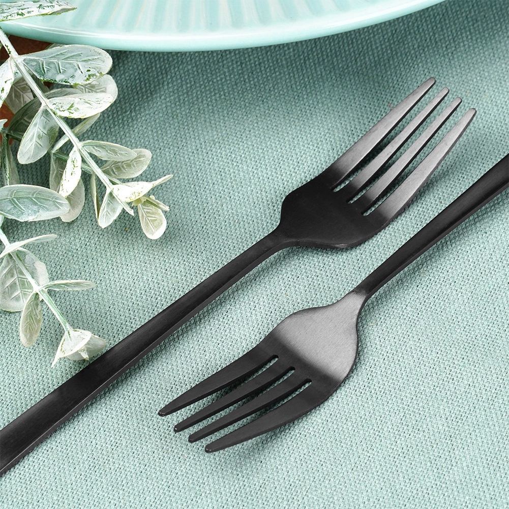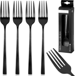 Oplemenitite pogrinjek s stilskimi desertnimi vilicami z mat črnim satenskim zaključkom. Zahvaljujoč kakovostnemu nerjavnemu jeklu so trpežne, zdravstveno neoporečne in dolgoročno ohranjajo svoj eleganten videz. Odlično se ujemajo tako s klasičnimi kot tudi modernimi kompleti posode.