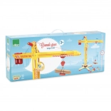 V paketu so premične figurice žerjavista in delavca, platforma, magnetna kljuka, različni tovori in prometna signalizacija za omejitev delovišča – skupaj 12 kosov dodatkov. Kakovostni materiali (masiven les, trpežna vezana plošča, kovinski elementi) in neškodljive barve zagotavljajo dolgo in varno zabavo.
