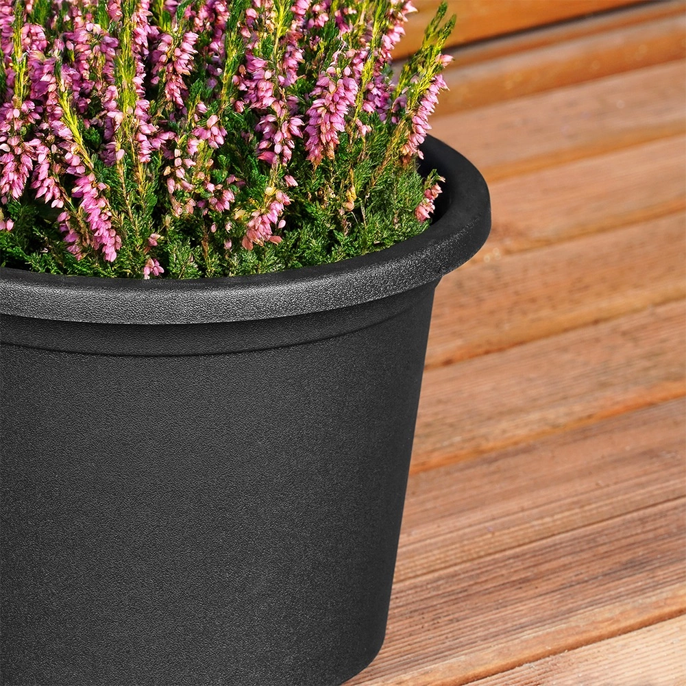 Praktičen in eleganten lonček za zunanjo uporabo s premerom 20 cm iz odporne plastike. Zaradi okrogle oblike in črne barve deluje prefinjeno ter je odlična izbira za balkon, teraso in vrt. Izdelan je iz 90 % recikliranega materiala in je 100 % mogoče reciklirati. Odporen na dež, veter in UV-sevanje ter preprost za vzdrževanje.