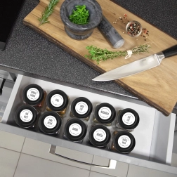 Minimalistična kvadratna zasnova se odlično poda v vsako kuhinjo – od gospodinjstev do gostinskih obratov. Široka odprtina omogoča udobno posipanje, polnjenje in pomivanje. Za še boljšo organizacijo lahko dodate samolepilne nalepke za označevanje.