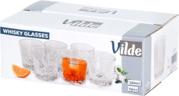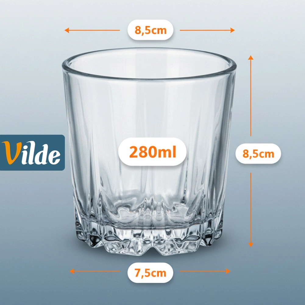 Ta set šestih kozarcev s prostornino 280 ml združuje brezčasen dizajn in praktičnost. Natančne mere 8,5 × 8,5 cm zagotavljajo udoben oprijem in stabilnost na mizi, medtem ko debelo dno ščiti pijačo pred hitrim segrevanjem od roke. Prosojno steklo poudari barvo viskija in drugih pijač ter doda vašemu pogrinjku eleganten videz.