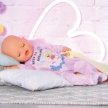 Dovolite svoji punčki, da počiva v slogu. Ta mehak pajac BABY BORN Little 36 cm v nežno rožnati barvi ima igriv potisk »Keep on rolling« z medvedkom in všite nogavičke, da punčki nikoli ne zebe v nožice. Zahvaljujoč ohlapnejšemu kroju ga lahko enostavno oblečejo in slečejo tudi manjši otroci.