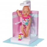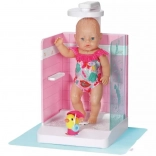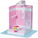 Praktično držalo za punčko varno drži dojenčka BABY born ali starejšega sorojenca na mestu, nastavljiva višina prhe pa se prilagodi obema velikostma. Priložena je tudi podloga proti škropljenju, ki ohranja okolico suho. Eleganten dizajn z rožnatimi ploščicami se odlično ujema z dodatki iz kolekcije Kopalnica.