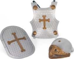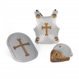 Set vsebuje vse, kar mali vitezi potrebujejo za uresničitev svojih junaških sanj – meč z nožnico, ščit, čelado in jopič.