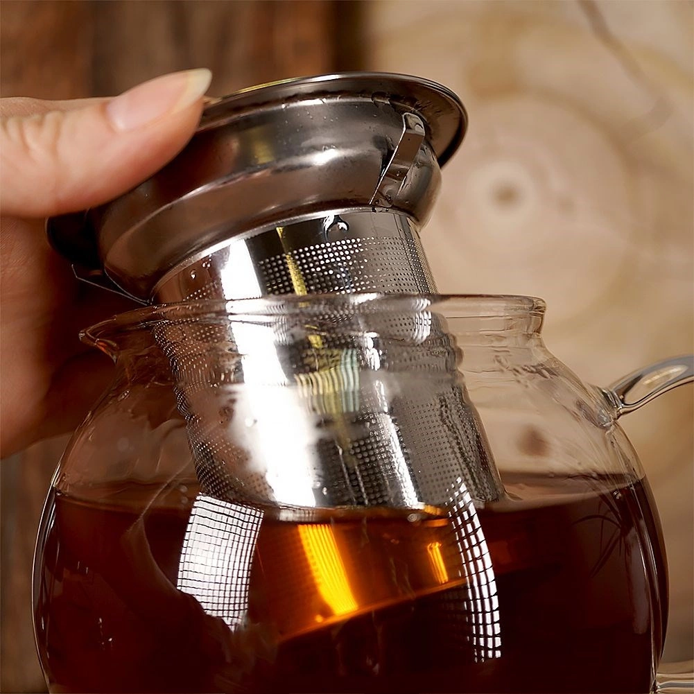 Fino nerjaveče cedilo zadrži lističe v notranjosti, po namakanju pa ga preprosto odstranite. Čajnica se tako v hipu spremeni v klasični vrč za pijače.