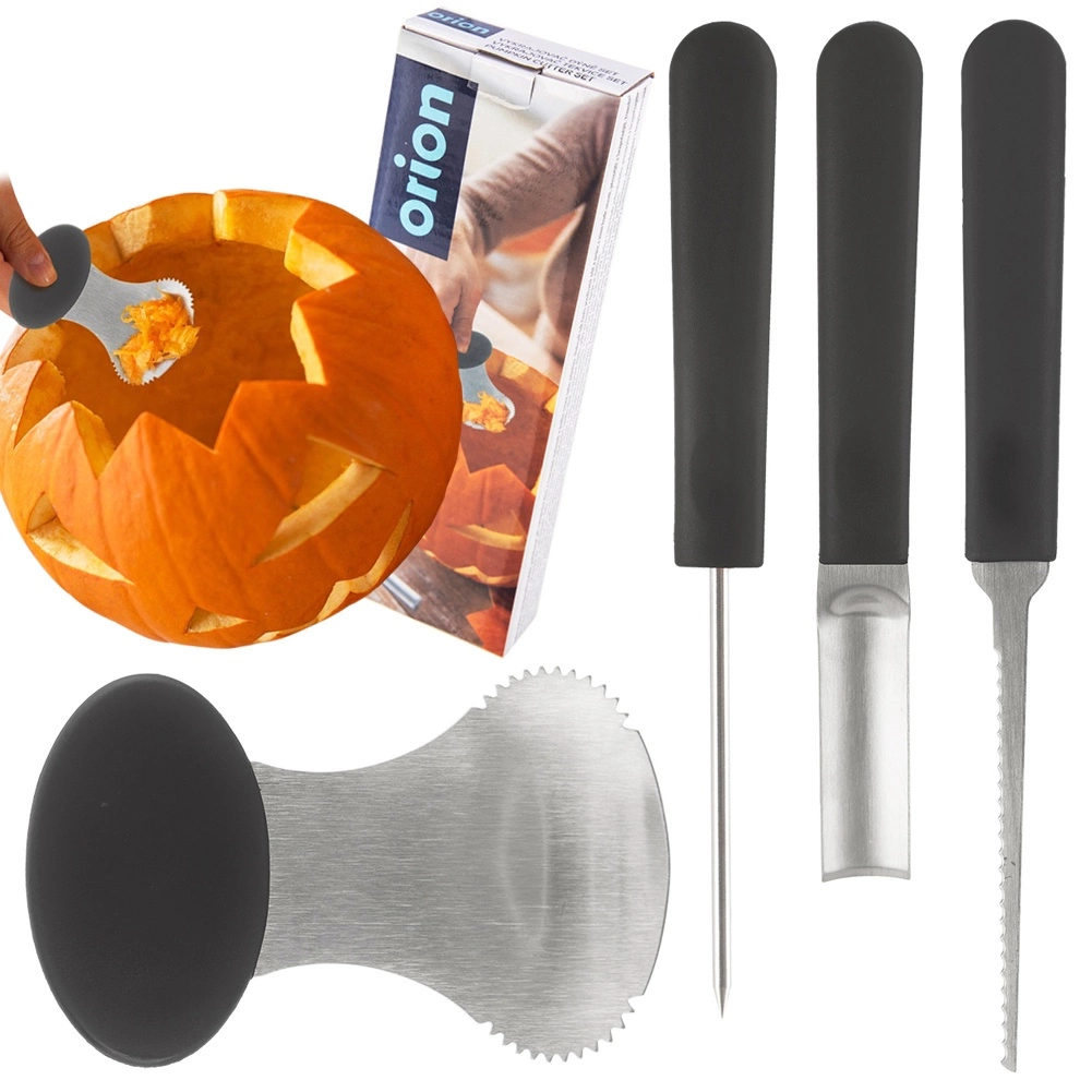 Odkrijte preprosto in varno izrezovanje buč, melon in drugega sadja s kompletom 4 orodij. Vsebuje lopatico, bodalo, profilirano dleto in nazobčan nož za natančno rezbarjenje, hitro odstranjevanje sredice in udoben oprijem. Izdelano iz nerjavečega jekla in trpežne plastike, primerno za pomivalni stroj.