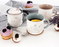 Praktična skodelica za vsak dan – ta 400 ml porcelanasta skodelica s cvetličnim line-art dekorjem združuje brezčasen videz in udobje pri uporabi. Ergonomski ročaj lepo sede v roko, zaobljen rob je prijeten pri pitju, siv notranji del pa doda nežen kontrast.