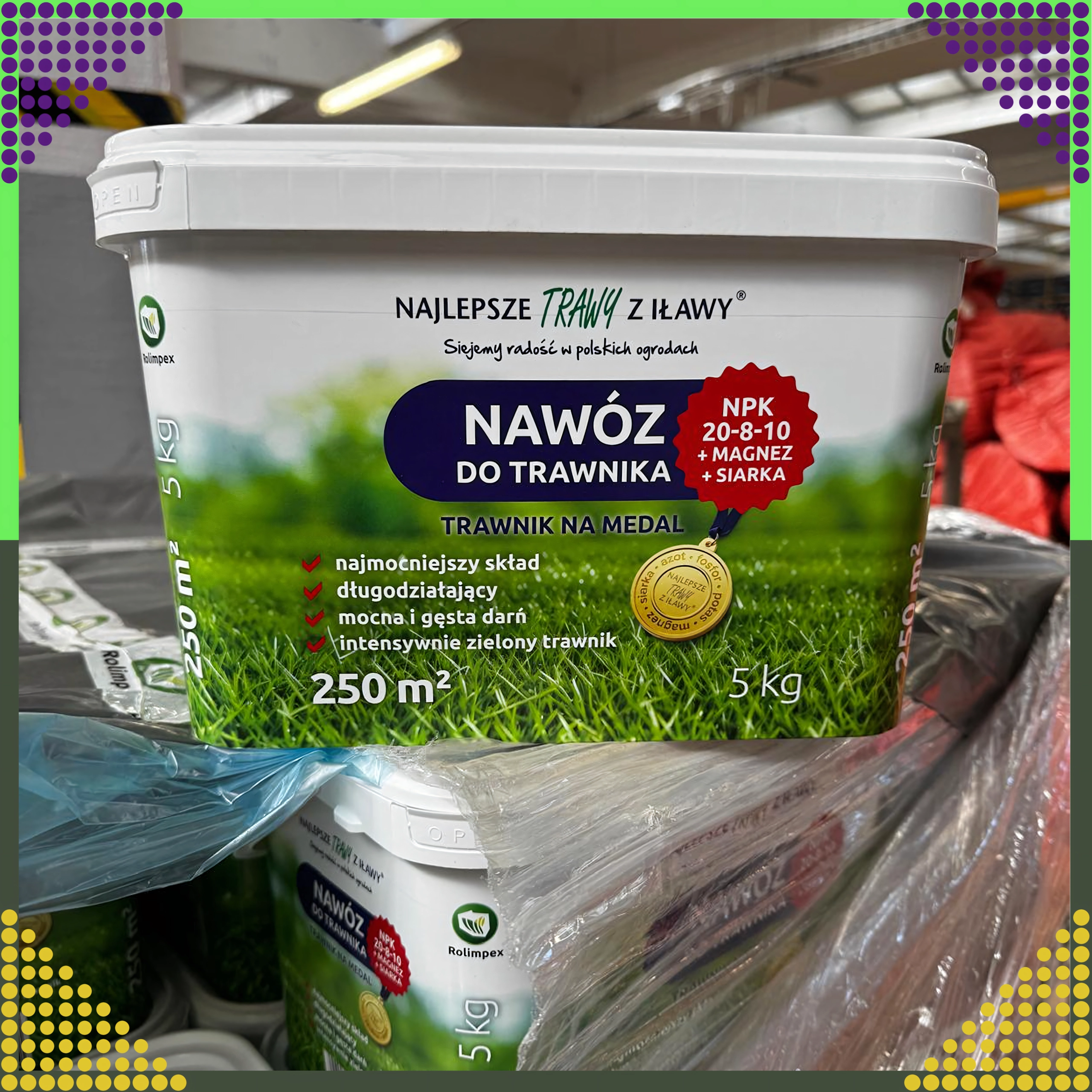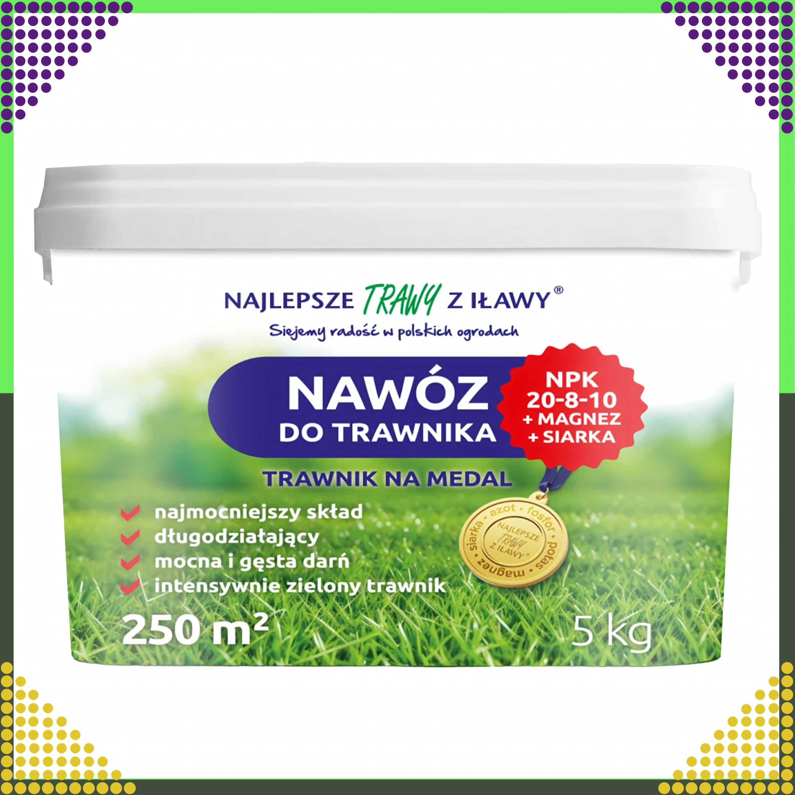- Priporočeni odmerek glede na stanje trate; pakiranje 5 kg pokrije do približno 250 m²