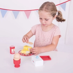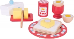 Postrezite uravnotežen zajtrk s tem barvitim lesenim kompletom, ki vključuje jajce, kruh, maslo in marmelado. Set je priložen z lesenim nožem za mazanje, stojalom za jajce, krožnikom in posodico za maslo.