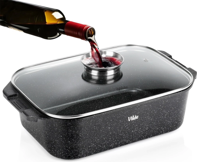 Vgrajeni dozirnik omogoča dolivanje vode, vina ali marinade brez dvigovanja pokrova – meso ostane sočno, pečica pa ne izgublja toplote.
