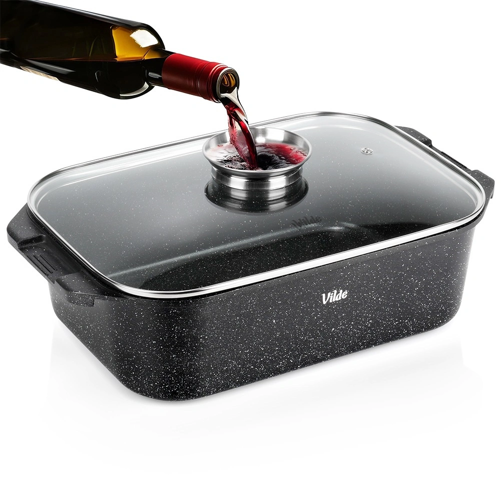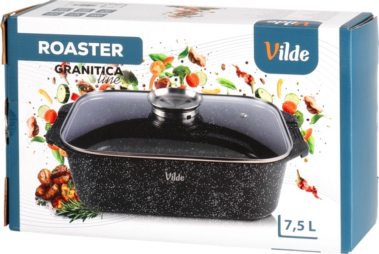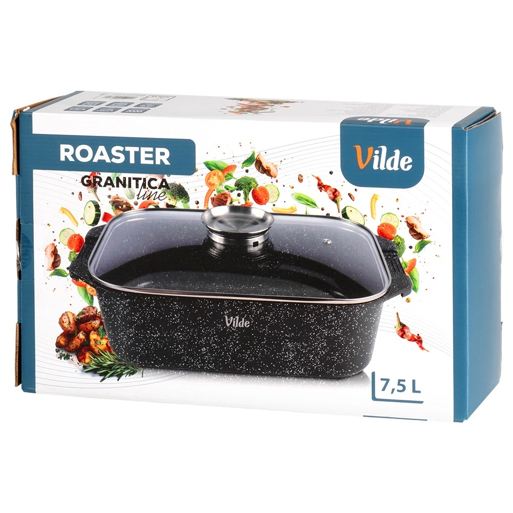 Prostoren granitni pekač s prostornino 7,5 l z temperaturno odporno stekleno pokrovko je idealen za peko, dušenje in zapekanje. Odporno lito aluminijasto telo z neprijemljivo granitno površino omogoča kuhanje z najmanj maščobe, odlično akumulira toploto in ohranja jedi dlje tople. Pokrov s vgrajenim dozirnikom omogoča dolivanje vode, vina ali tekočih začimb brez dvigovanja pokrova.