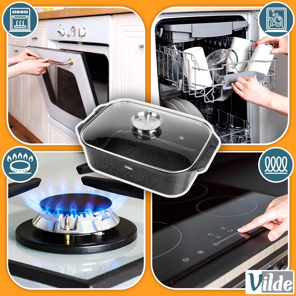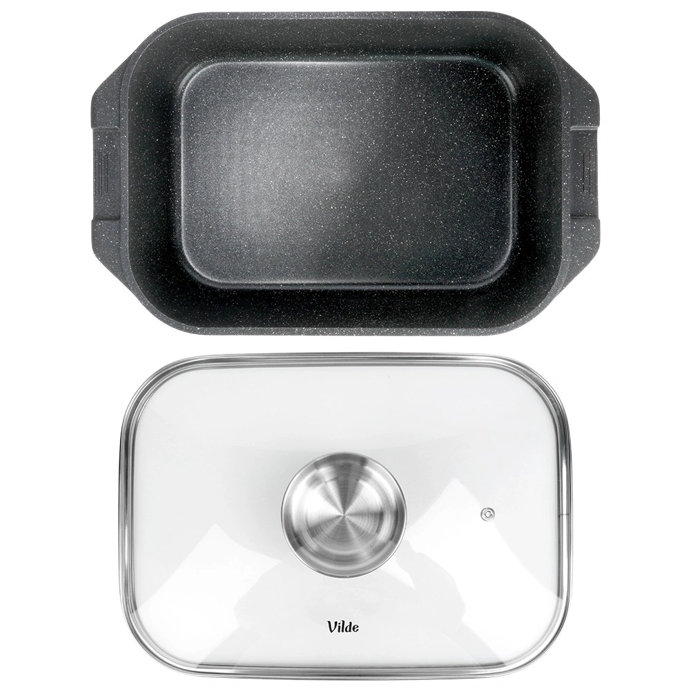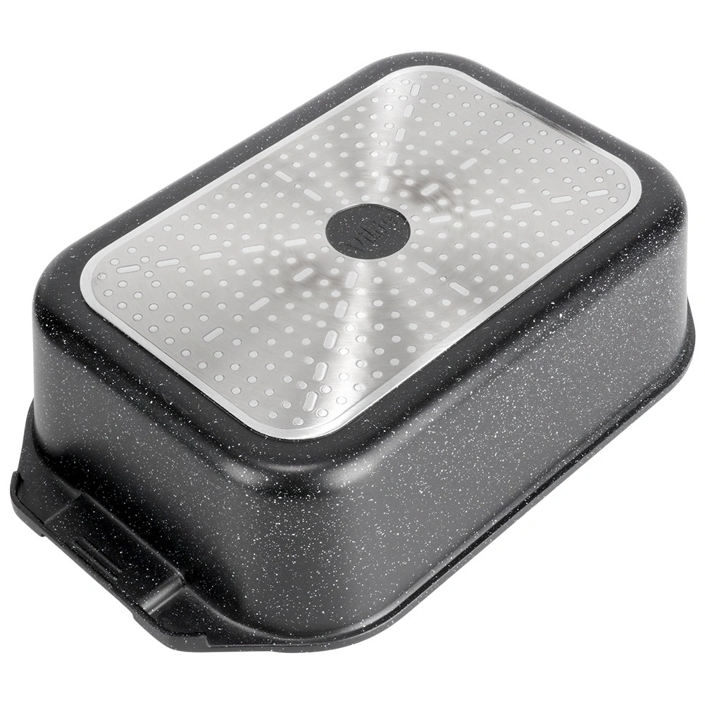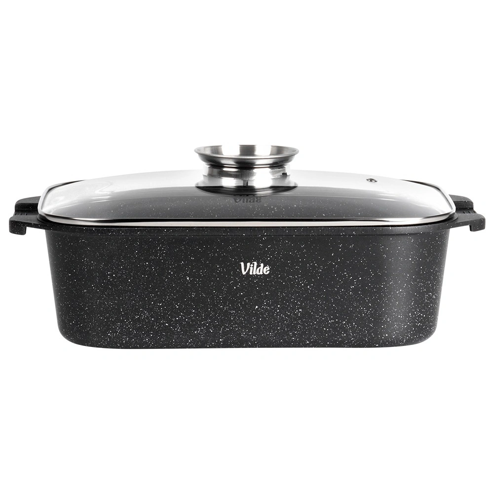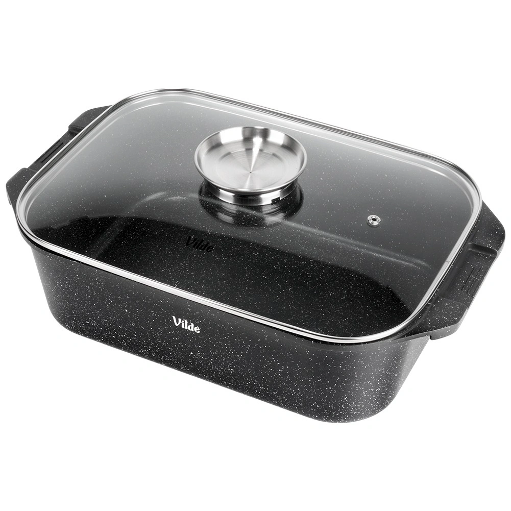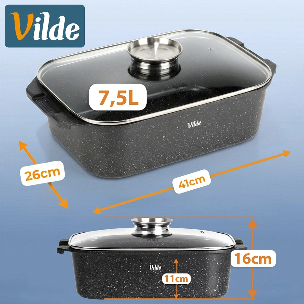 Univerzalni pekač z merami 41 × 26 × 16 cm (višina posode brez pokrova 11 cm) je zanesljiv pomočnik za vsakodnevno kuhanje. Robustni liti aluminij z neprijemljivo granitno plastjo zagotavlja enakomerno porazdelitev toplote in enostavno sproščanje jedi. Steklena pokrovka je temperaturno odporna in omogoča udoben nadzor priprave.