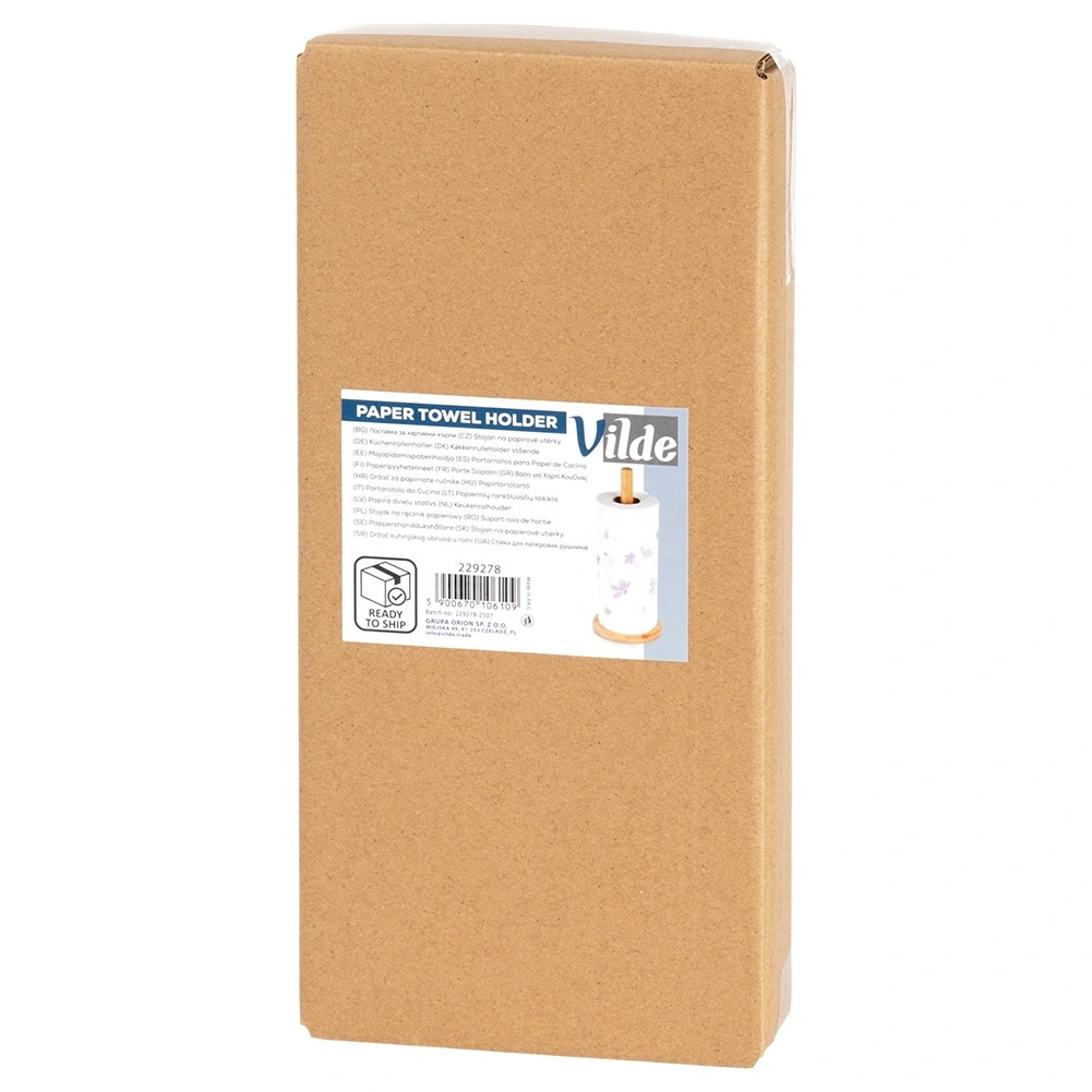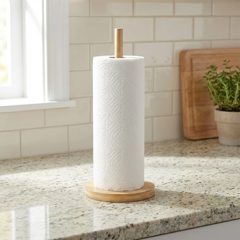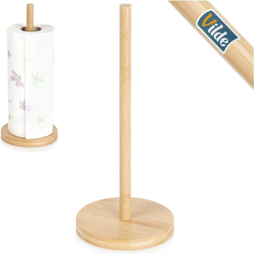 Elegantno in trpežno stojalo iz naravnega bambusa je odličen pomočnik za vsako kuhinjo, pisarno ali kopalnico. Zahvaljujoč univerzalni velikosti sprejme kratke in daljše rolice, zavzame malo prostora in zaradi stabilnega podnožja čvrsto stoji na delovni površini.