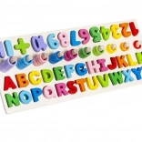 Ta večnamenska lesena sestavljanka združuje zabavo in učenje v enem. Otroci med igro spoznavajo oblike črk in številk, se jih učijo poimenovati, sestavljajo prve preproste besede ter vadijo štetje s pomočjo obročkov na količkih. Žive barve spodbujajo raziskovanje ter podpirajo ustvarjalnost in zbranost.