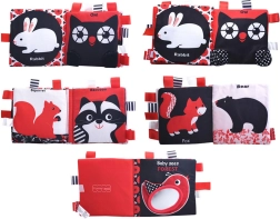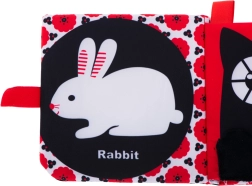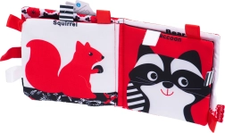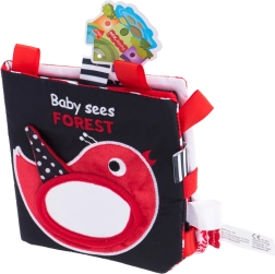 Pripravite svojega otroka na čarobno pot odkrivanja sveta oblik in vzorcev s to čudovito knjigo. Knjiga je oblikovana v kontrastnih barvah, kot so črna, bela in rdeča, ki so idealne za vizualno stimulacijo majhnih otrok. Knjiga vsebuje štiri tekstilne strani z živalmi, kot so ptiček, zajček, sova, lisica, medved, veverica in rakun.