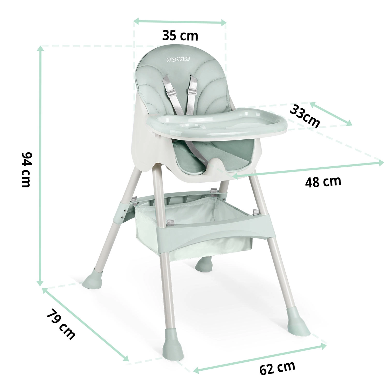 Varnost zagotavljajo 5-točkovni pasovi in nedrseče nogice, ki stolček stabilno držijo na katerikoli podlagi. Zložljiva konstrukcija prihrani prostor – zložite jo v hipu in enostavno shranite. Del paketa je tudi praktična košara za igrače in drobnarije, da imate vse potrebno vedno pri roki.