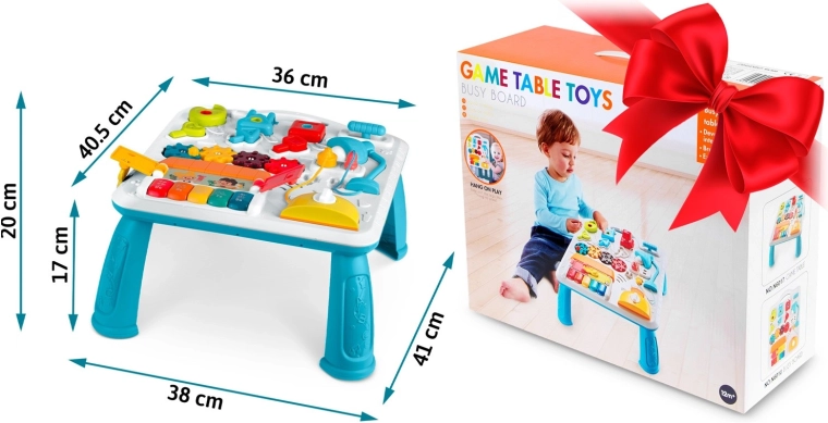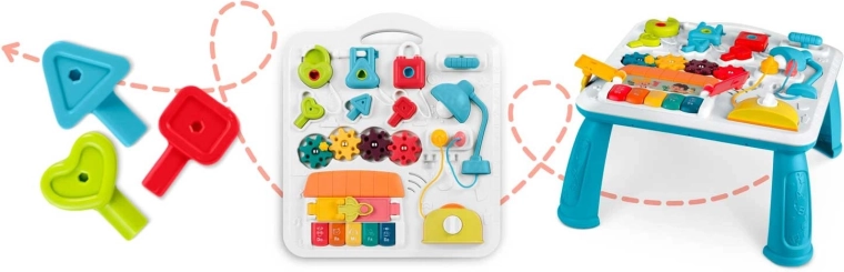 Multifunkcijska otroška mizica in tabla v enem podpira senzomotorični razvoj in učenje skozi igro. Zahvaljujoč snemljivemu panelu jo otrok uporablja pri igri stoje ali kot prenosno senzorično tablo na tleh oziroma na poti. Bogata paleta elementov – klavirček z notami in zvoki živalic, svetleča lučka, gumbi, drsniki, izvlečni »toster«, hišica z vratci ter tri ključavnice s ključki – spodbuja koordinacijo oko–roka, logiko in razločevanje oblik.