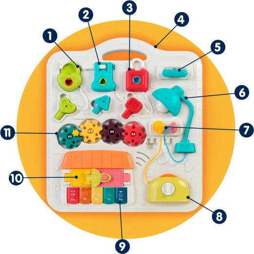 Klavirček (note in zvoki živali), LED lučka, zobata kolesa, drsni in pritiskalni elementi, izvlečni »toster«, hišica z vratci, ključavnice s ključki (srce, trikotnik, pravokotnik)