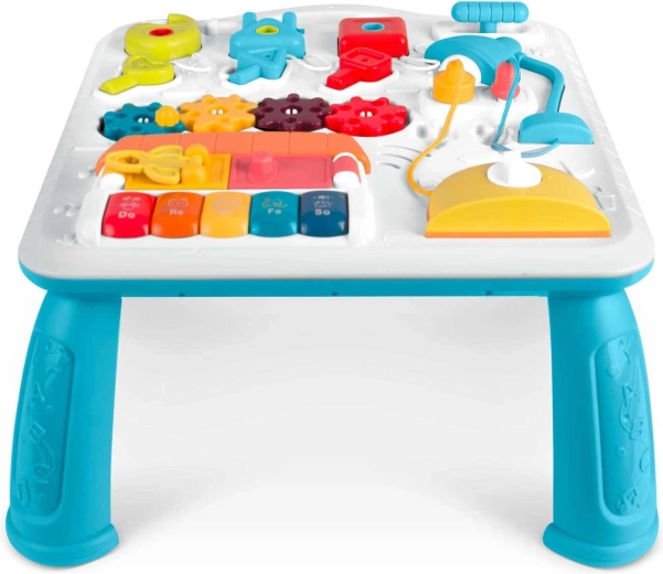 Starši bodo cenili možnost popolnega izklopa in dvonivojsko nastavitev glasnosti. Mizica je stabilna, trdna in barvno spodbudna, z hitro in enostavno montažo. Idealna je kot darilo za otroke od 12 mesecev, ki se bodo z njo igrali dolge ure ter hkrati spoznavali barve, številke in princip vzrok–posledica.