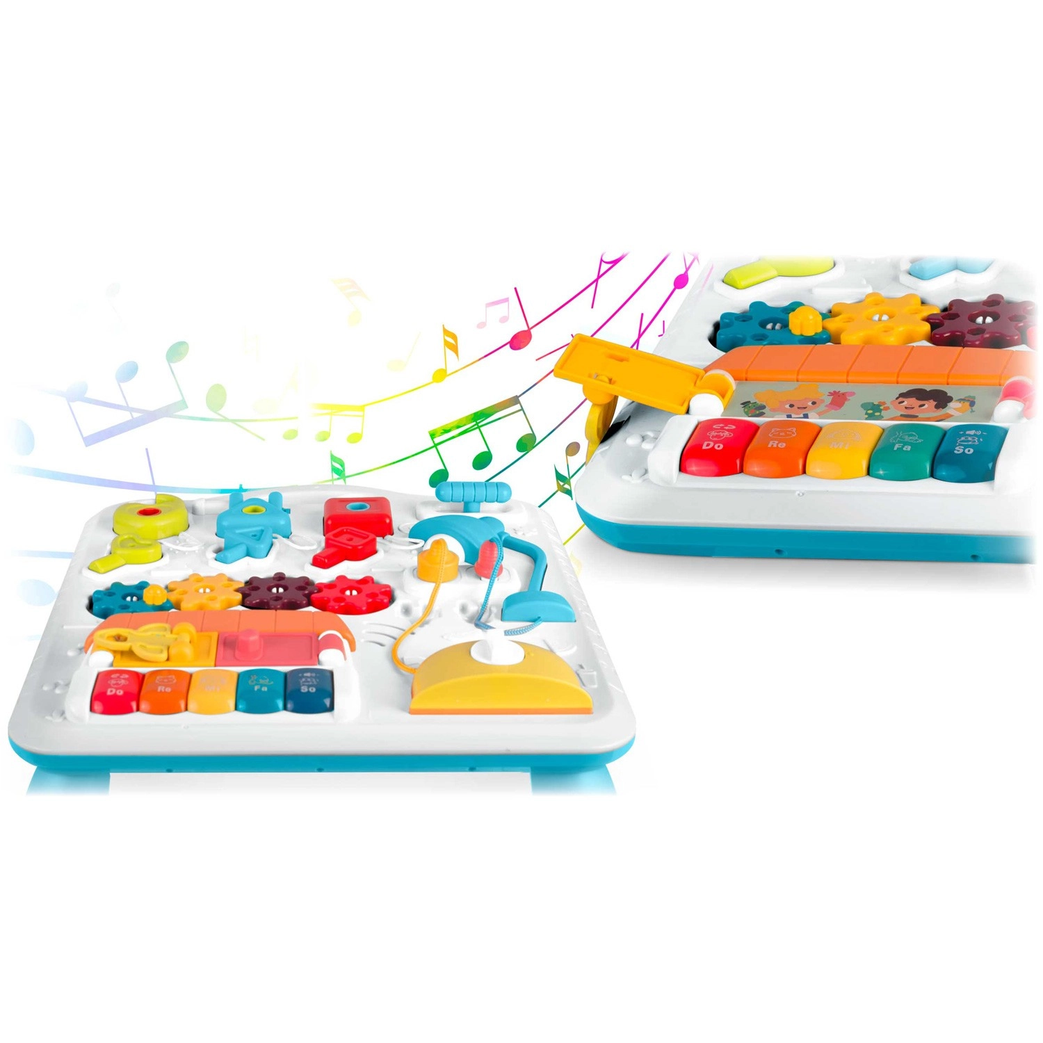 Barvita izobraževalna mizica 2 v 1 s snemljivo tablo RICOKIDS spremeni učenje v zabavo. Ponuja glasbeni klavirček, svetlečo LED lučko, vrteča zobata kolesa, ključi in ključavnice ter veliko drsnih in pritiskalnih elementov za razvoj fine motorike, zaznavanje oblik, barv in števil. Stabilna konstrukcija, stikalo in dvonivojska nastavitev glasnosti bosta razveselila tudi starše.