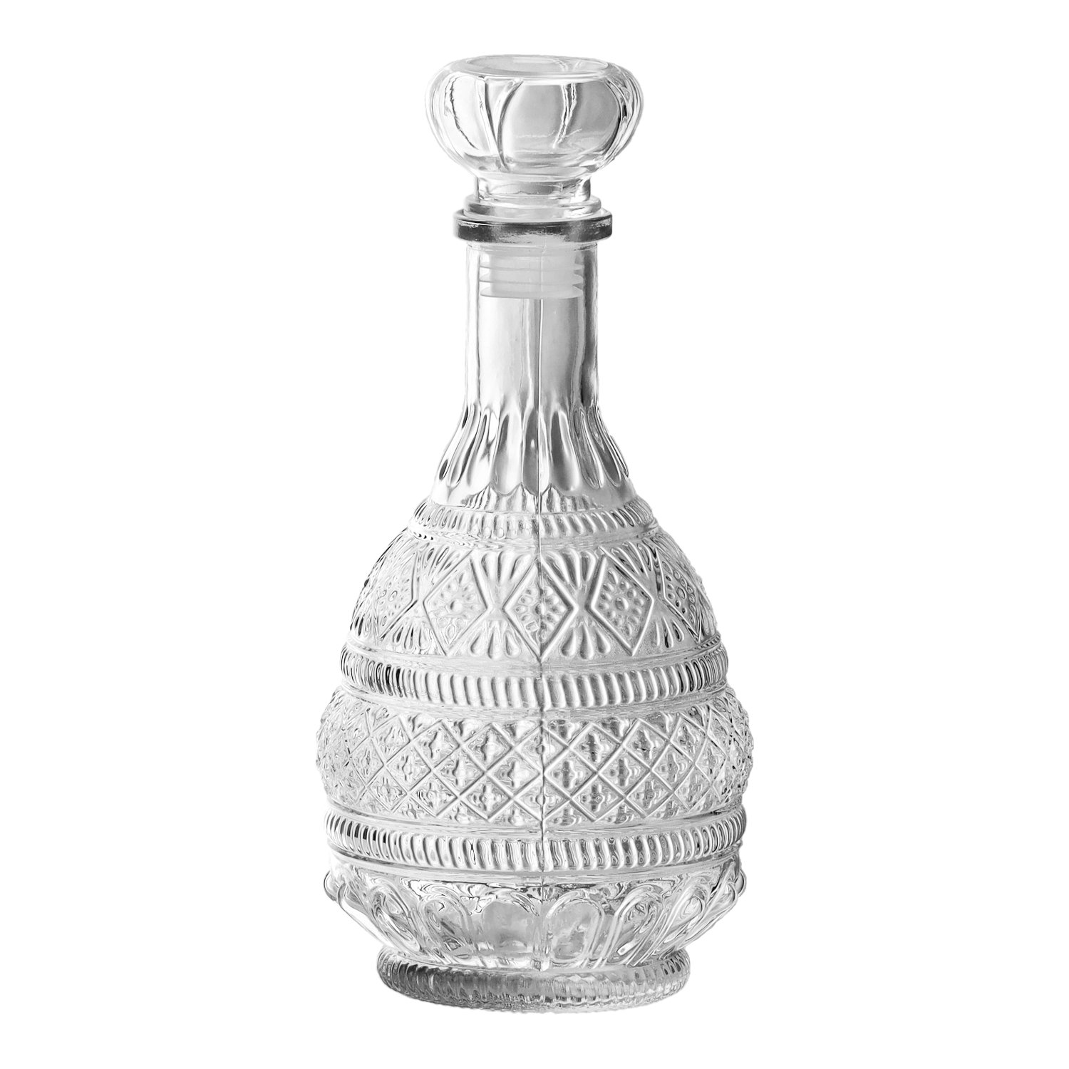 Ta univerzalna karafa je stilski dodatek za domači bar in slavnostno mizo. Njen okrašen dizajn poudari barvo pijače, močno, jasno steklo pa zagotovi varno shranjevanje brez neželenih vonjav. Stekleni zamašek s tesnilom preprečuje izhlapevanje arome, zato boste dalj časa uživali v polnem okusu.
