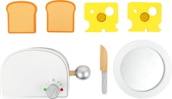 Set vključuje toaster, 2 rezini toasta, rezine sira z ježkom, lesen nož in krožnik. Deli so prijetni na otip in varni za male kuharje. Igra podpira koordinacijo oko–roka, kreativnost in komunikacijo pri igri vlog.
