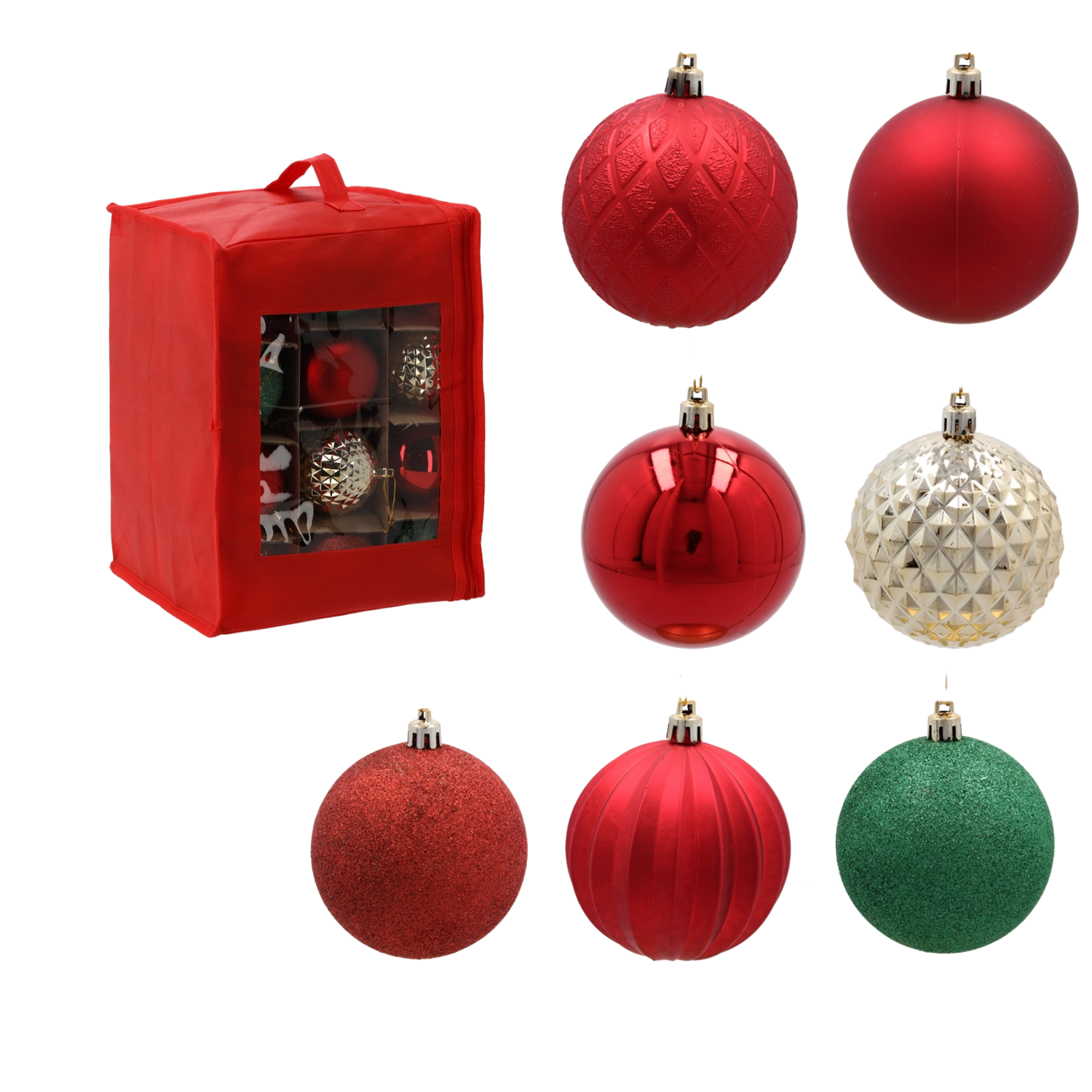 Elegantni set 36 božičnih krogel premera 8 cm v tradicionalnih barvah rdeče, zlate in zelene bo vašemu drevesu dodal edinstven lesk. Okrasje je iz nelomljivega materiala, ima mešanico bleščečih, mat in bleščeče posutih površin ter je opremljeno z zlatimi ali srebrnimi vrvicami za enostavno obešanje. Idealno za božično drevo, vence in praznične aranžmaje.