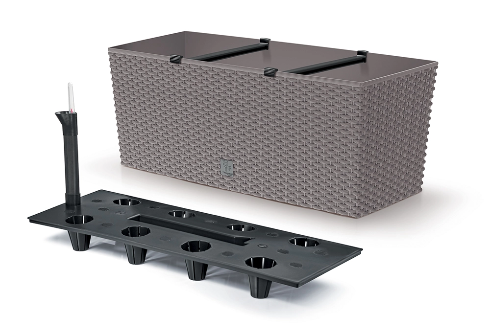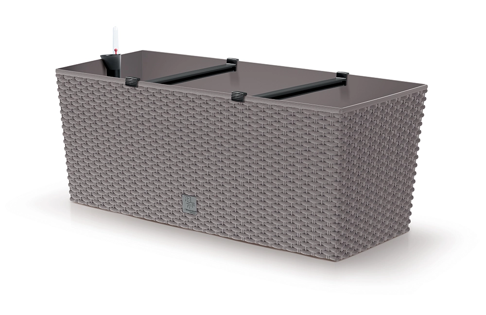 Eleganten samonamazalni koritar z verodostojnim ratanastim videzom v barvi mocca je idealen za notranjo in zunanjo uporabo. Zahvaljujoč kakovostni plastiki je odporen na UV-sevanje in vremenske razmere, ima dolgo življenjsko dobo ter olajša nego rastlin z integriranim namakalnim sistemom in kazalnikom nivoja vode.