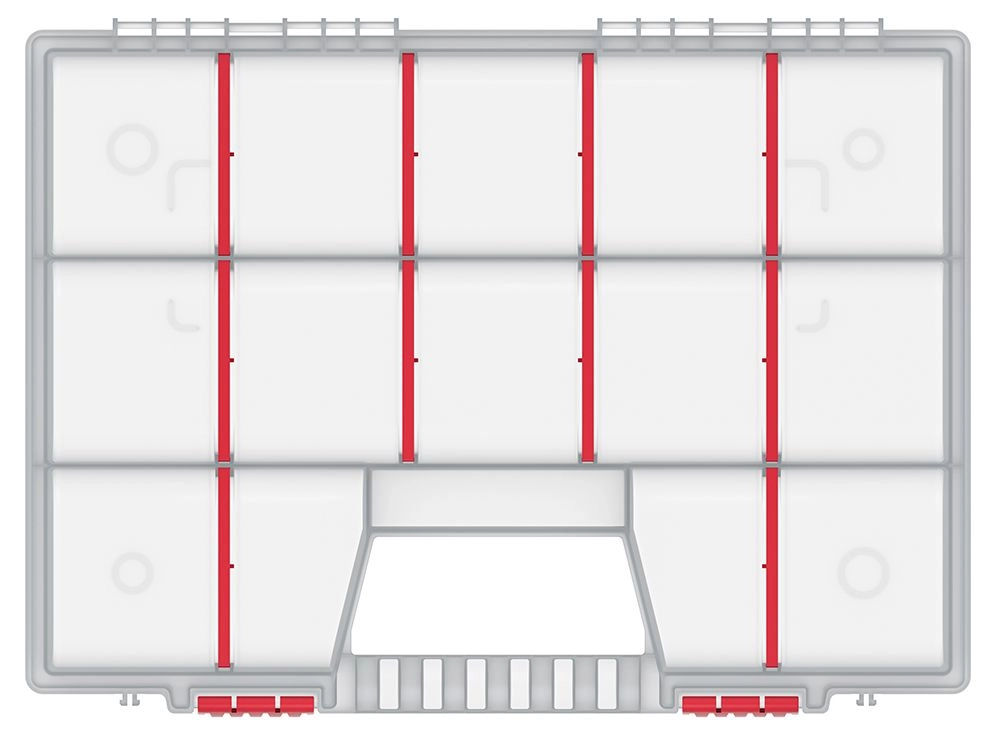 Prilagodljivo razporeditev omogočajo odstranljive pregrade – velikost in število predalčkov zlahka prilagodite trenutnim potrebam. Ergonomski ročaj olajša prenašanje, trdne sponke pa držijo pokrov varno zaprt tudi med transportom.