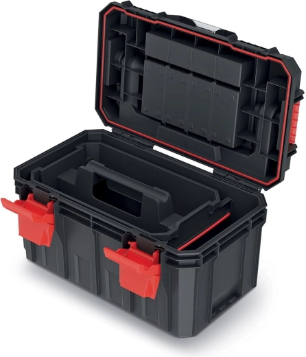 Premišljena notranja razporeditev z odstranljivo vložko in predelki v pokrovu olajša razvrščanje drobnega pribora in ohranja orodje vedno pri roki. Ergonomski zložljiv ročaj zagotavlja udoben oprijem in zanesljivo nošenje. Črna izvedba z rdečimi poudarki deluje profesionalno in se poda v vsako delovno okolje.
