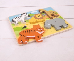Odkrijte zabavno leseno vstavljanko s safari motivi, ki podpira zgodnji razvoj otroka. Puzzle ponuja velike, lahko oprijemljive koščke, s katerimi si otroci urijo fino motoriko, senzorično zaznavanje in koncentracijo. Tisk na osnovni plošči pomaga pri pravilnem razvrščanju oblik in barv ter povečuje izobraževalno vrednost igre.
