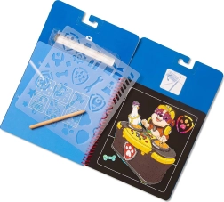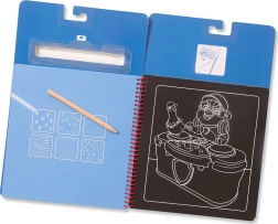 Dovolj je vzeti priloženo leseno rezkalo, nežno postrgati črno plast in pod njo se pokažejo pisane slike. Priložene šablone in nalepke pomagajo otrokom ustvariti lastne motive ter razvijati fino motoriko, kreativnost in potrpežljivost.