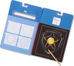 Pod črno plastjo se skrivajo živi motivi TAČKE NA PATRULJI. Otroci zlahka ustvarijo privlačne slike brez barv ali lepila.