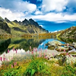 Prikazuje spokojno Starolesniansko jezero z odsevom tatriških vrhov, cvetjem v ospredju in kristalno čisto vodo.