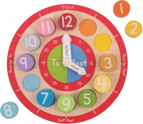Ta kakovosten leseni izobraževalni pripomoček prinaša otrokom od 18 mesecev dalje zabaven način učenja števil, barv, oblik in osnov merjenja časa. Barvno usklajeni koščki s številkami 1–12 se vstavljajo v ustrezne reže, s čimer spodbujajo prepoznavanje oblik in barv ter koordinacijo oko–roka. Jasni angleški napisi na številčnici pomagajo naravno osvojiti besedne zveze, ki se uporabljajo pri določanju časa.